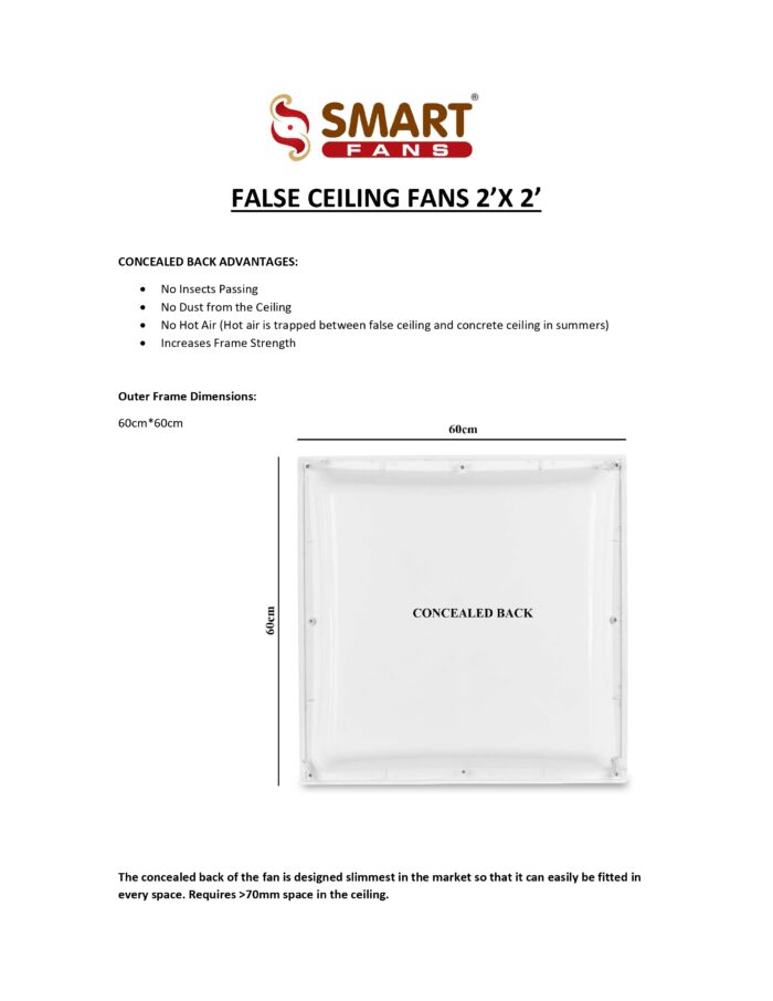 SMART FANS 2’X2′ False Ceiling Fans are designed to replace the ceiling fans in any air conditioned room. Our False ceiling fans will maintain your space’s sleek and modern look blending naturally with the ceiling. It is a great package of elegant aesthetics, circulates air 360 degrees covering a wide area.