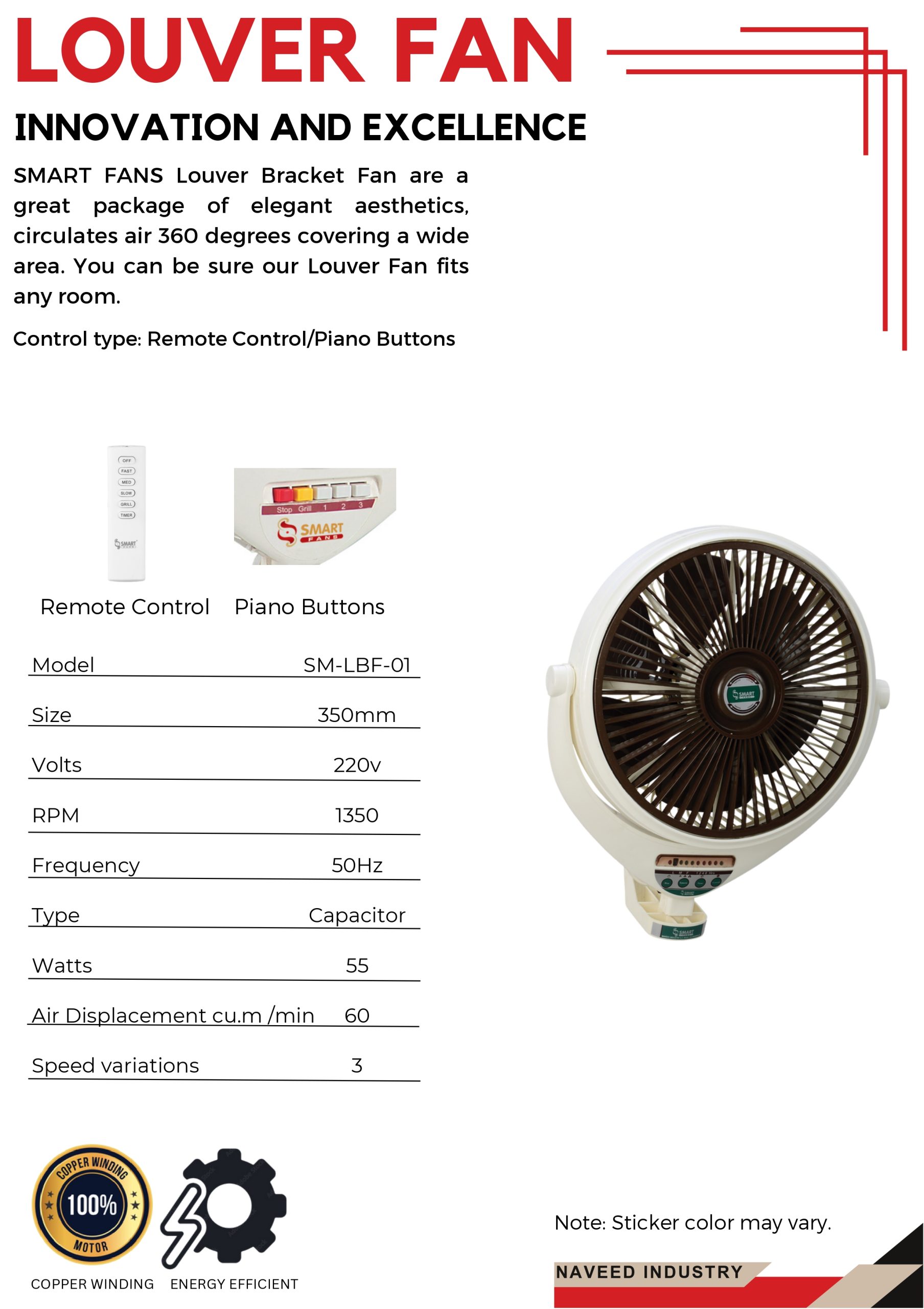 SMART FANS Louver Bracket Fan are a great package of elegant aesthetics,circulates air 360 degrees covering a wide area. You can be sure our Louver Fan fits any room.Control type: Remote Control/Piano Buttons